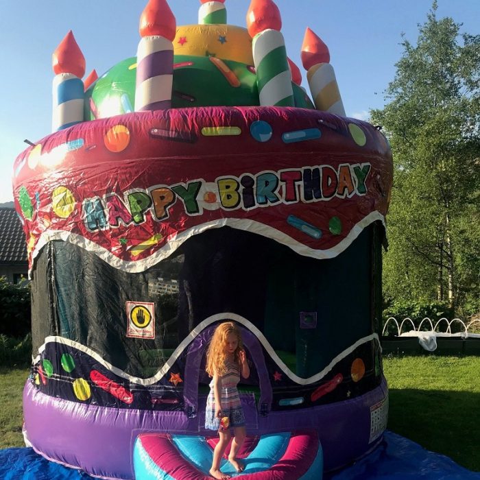 Hoppeslottet er formet som en rund kake med lys kakelys på toppen. Passer barn i alderen 5-12. år