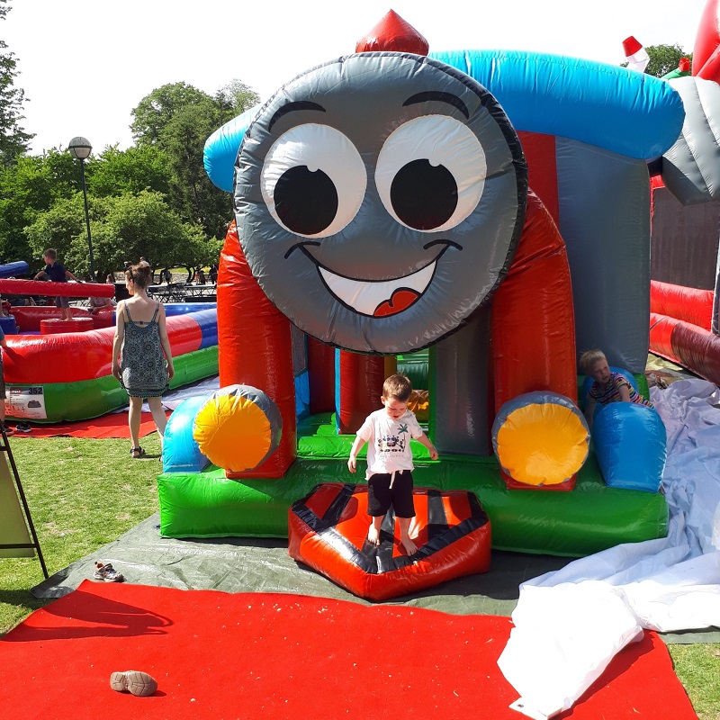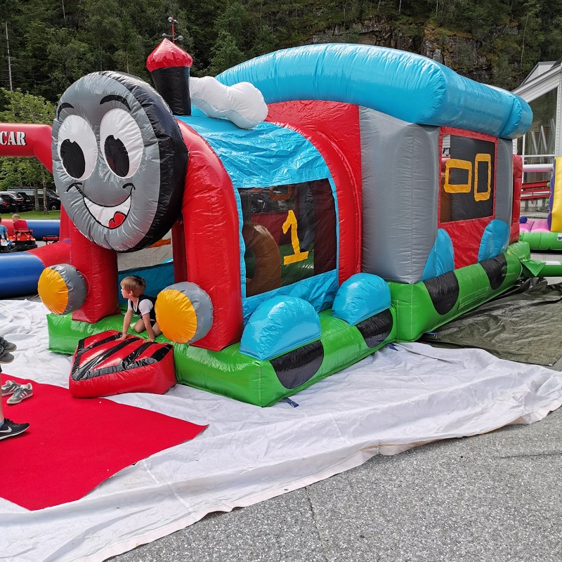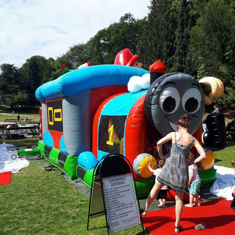Hoppeslott utformet som et tog. Her må barna komme seg igjennom ulike hindre, før de klatrer opp en stige og sklir ned sklien. Passer alle barn i alderen 5-13 år. Størrelse L=8m B=4m.