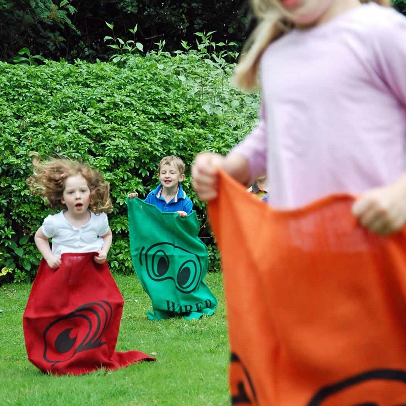 seg i hver sin sekk og skal ta seg frem en viss strekning ved å hoppe. Vinneren er selvfølgelig den som hopper først over mållinjen.