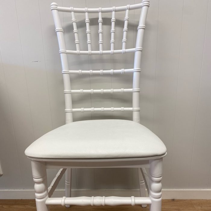 En eksklusiv stol med et herskapelig design. En stol som er et foretrukket valg til mange ulike fester, markeringer, jubileer og ikke minst brylluper. Vi tilbyr to farger på puten i setet, hvit og sort. På denne stolen sitter alle aldre godt i mange timer. Stolen er produsert av plast og kan dermed også brukes utendørs.